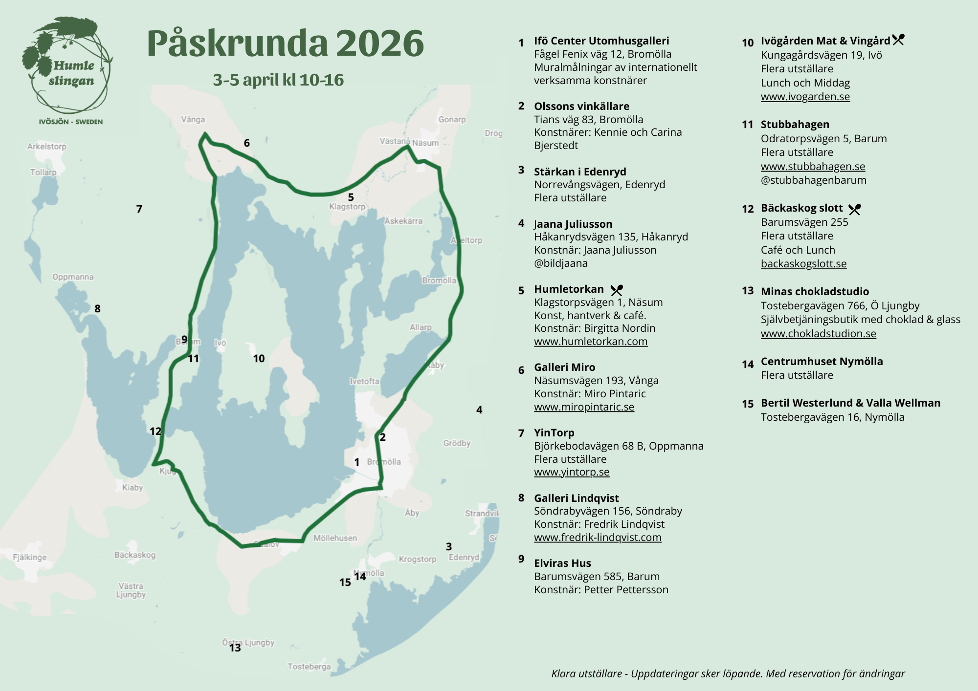 Våren spirar, fåglarna kvittrar och längs de slingrande vägarna kring Skånes största sjö, Ivösjön i nordöstra Skåne, vaknar kreativiteten till liv. Under påsken bjuder föreningen Humleslingan in till en vårutflykt runt Ivösjön och våra medlemmar öppnar sina dörrar och bjuder in till upplevelser